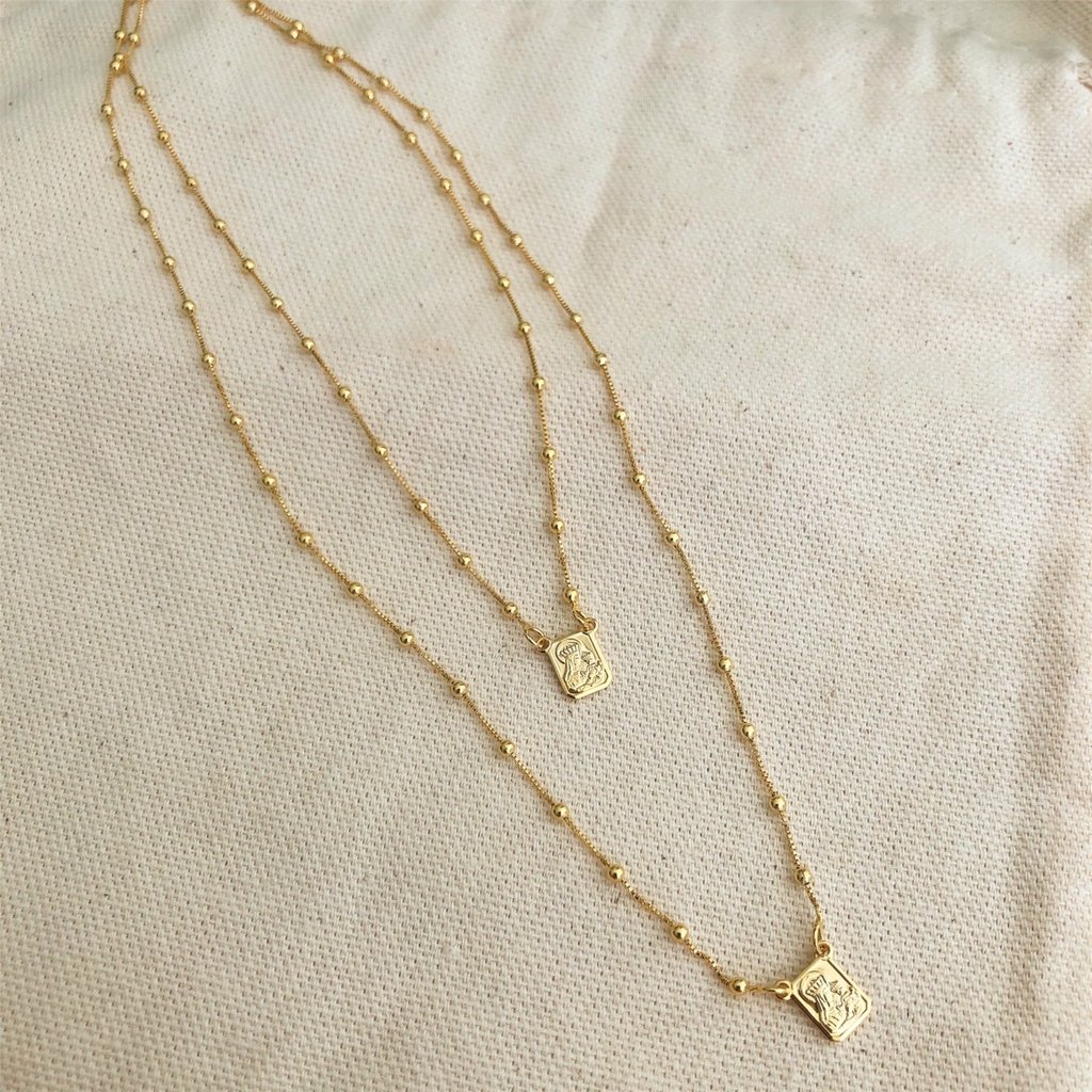 COLAR ESCAPULÁRIO EM CORRENTE FINA COMPOSTA POR MINI ESFERAS EM TODA A SUA EXTENSÃO E MEDALHA COM A IMAGEM DE NOSSA SENHORA + FRASE " PELA GRAÇA SÓIS SALVOS" PEÇA FOLHEADA A OURO 18K, LIVRE DE NÍQUEL EM SUA COMPOSIÇÃO, APRESENTA 44CM DE EXTENSÃO.